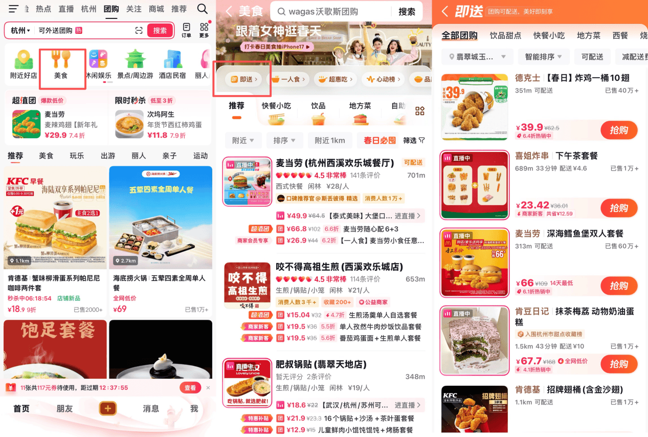 在壹览商业看来,“随心团”本质上是团购业务的一种延伸。用户购买团购套餐后,既可以到店核销,也可以选择配送到家。也就是说,它更像是“团购+配送”的组合形态,核心仍然是团购商品。而更名为“抖音即送”后,这一业务的重点开始从“团购”转向“到家履约”。平台不再把它当作团购的补充选项,而是更明确地指向即时配送场景,试图强化用户对“到家服务”的认知。