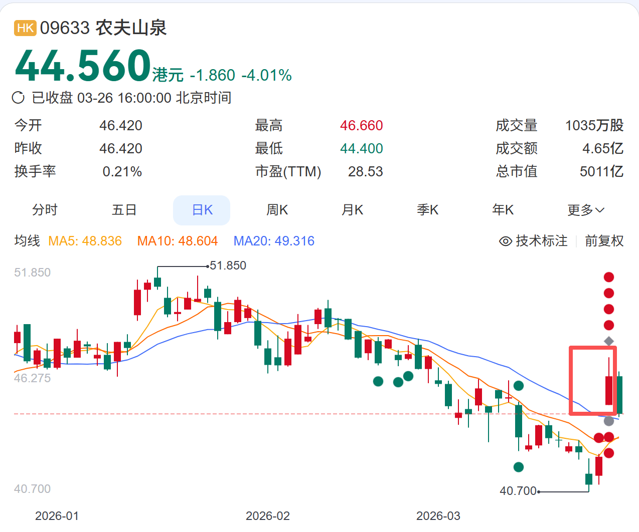 业绩公告发布后,农夫山泉(09633.HK)股价一度大涨超8%,股价最高攀升至47.36港元/股。截至3月25日收盘,农夫山泉股价为46.42港元/股,总市值达5221亿港元。