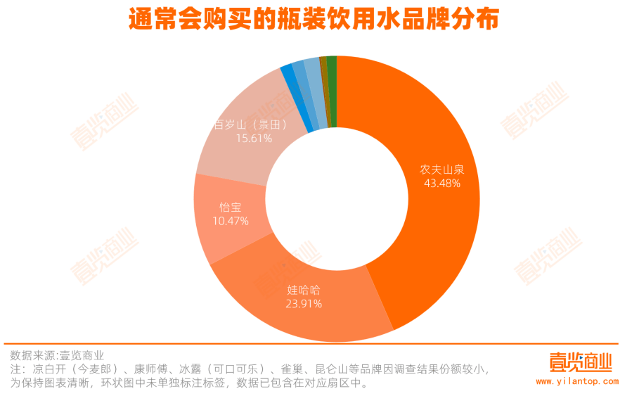 从最核心的购买行为来看,农夫山泉依然展现出强大的市场统治力。在“通常会购买的瓶装饮用水品牌”这一开放性问题中,农夫山泉以43.48%的选择率高居榜首,领先第二名娃哈哈近20个百分点。这表明,尽管经历负面事件,其“天然水”的品类心智定位依然根深蒂固,并未被根本性动摇。