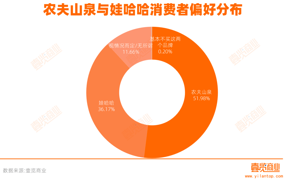 更关键的是,在“强制二选一”的极端情境下,仍有51.98%的受访者倾向于选择农夫山泉,比娃哈哈高出近16个百分点。这组数据有力地证明,农夫山泉在实际购买偏好上依然保有坚实的用户底盘,其品牌忠诚度超出预期。