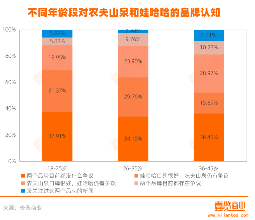 然而,当我们从具体的购买行为转向更抽象的品牌形象认知时,会发现舆论的余波并未完全平息。调查显示,虽然有35.38%的受访者认为两个品牌目前都没什么争议,但仍有26.48%的人认为“娃哈哈口碑很好,农夫山泉仍有争议”,这一比例略高于认为“农夫山泉口碑很好,娃哈哈仍有争议”的23.72%。