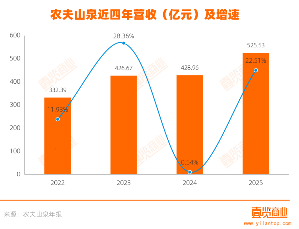 整体来看,农夫山泉的业绩已经实现了强劲反弹,达到新高。2025年,农夫山泉实现总营收525.53亿元,首次突破500亿元,同比增长22.51%。这一增速与2024年近乎零增长的窘境形成鲜明对比,显示出明显的复苏态势。