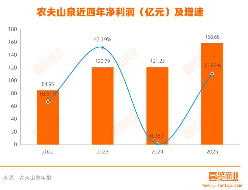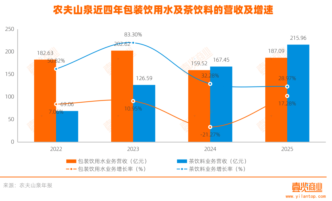 最受关注的包装饮用水业务,也迎来了反弹。在经历2024年同比暴跌21.27%、营收额跌至2021年的水准后,2025年,该业务营收达到187.09亿元,同比增长17.28%。虽然还未恢复至2023年202.62亿元的历史高点,但双位数增速无疑释放了一个强烈的积极信号。