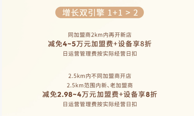 更值得一提的是区域深耕优惠。同加盟商在2km内再开新店,减免4-5万元加盟费,设备享8折;2.5km内不同加盟商开店,新老加盟商均可减免2.98-4万元加盟费,设备享8折。