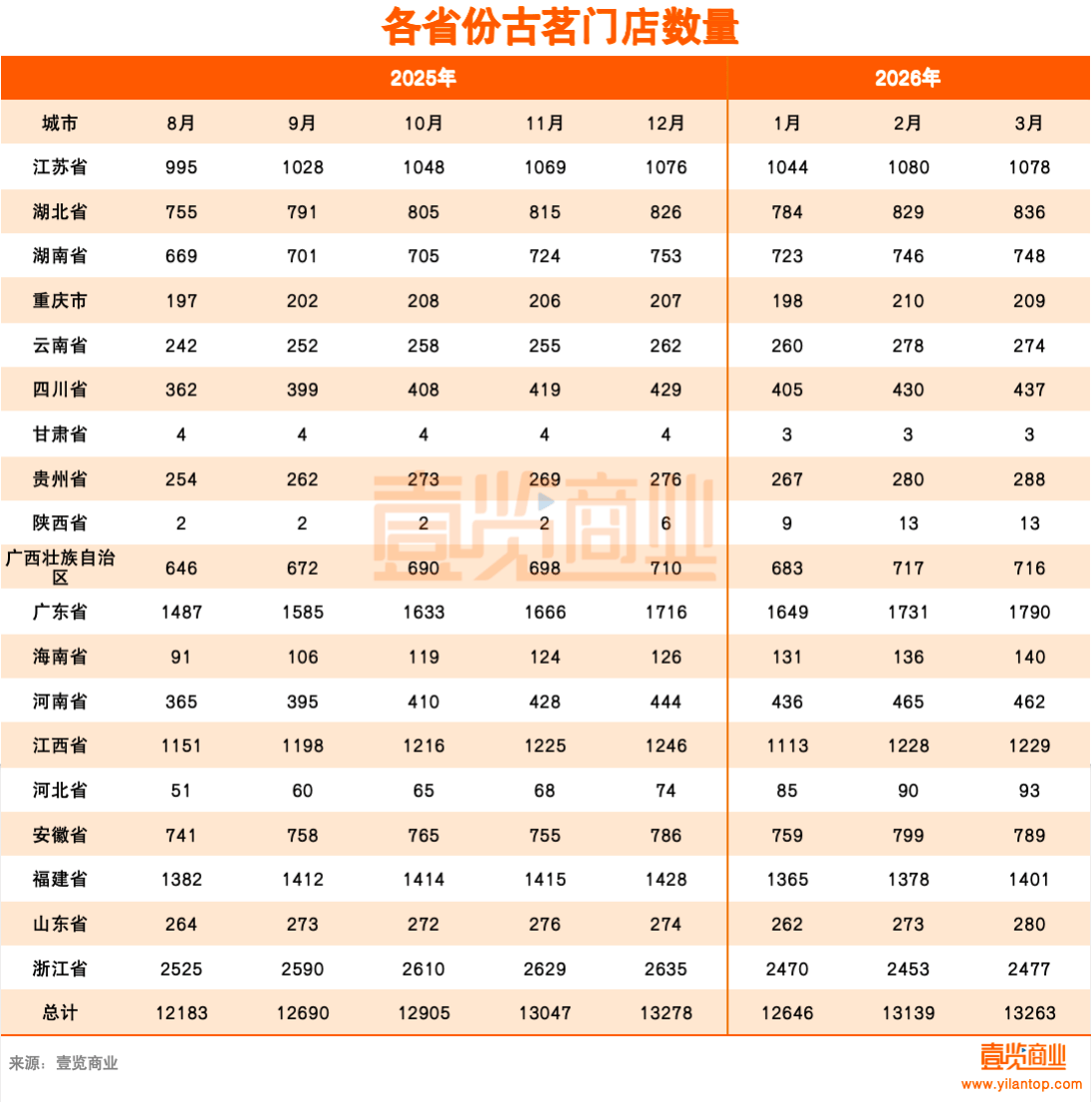 在古茗的扩张版图中,以南京、上海为代表的高线城市长期处于“空白区”。从门店结构来看,其在高线城市的布局亦相对克制。壹览商业数据显示,截至今年3月底,古茗全国门店数已超过13000家,但一线城市门店仅368家,占比约3%;新一线城市1895家,占比约14%。