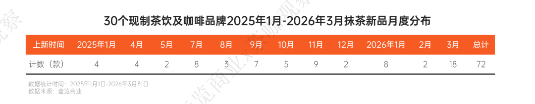 壹览商业统计,2025年1月至2026年3月,30个主流现制茶咖品牌共推出72款含抹茶元素的新品,从月度分布看,2026年3月单月上新18款,创下历史峰值。春秋两季构成两大推新高峰,显示出抹茶与季节更替、消费场景的强绑定关系。