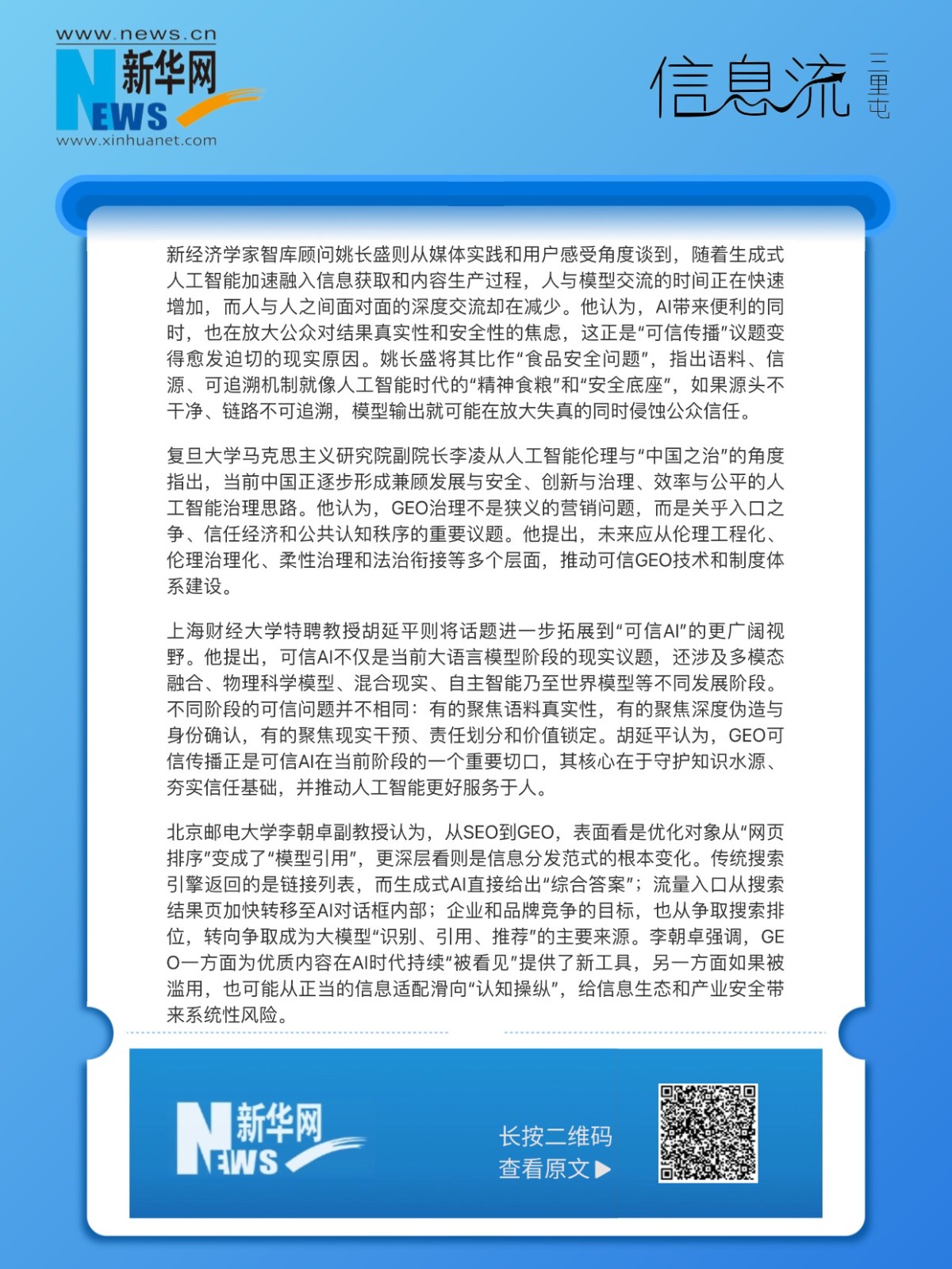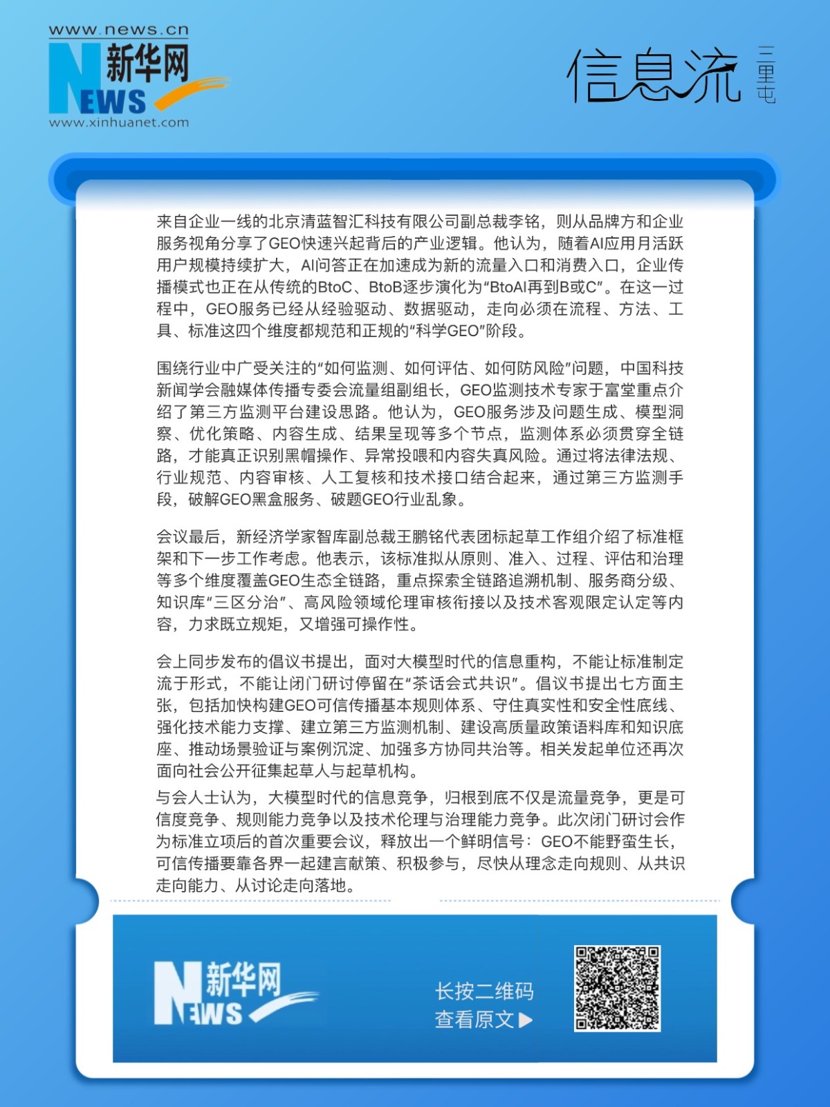 新经济学家智库副总裁、三里屯信息流创始人王鹏铭会上表示:我们申请这份标准的出发点就是要让GEO行业走在阳光下,要“安全可信”。