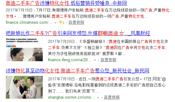 如:奥迪二手车广告因为有物化女性倾向,被网友们diss了。