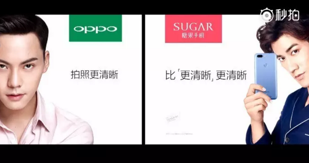 瞄准OPPO打出“比清晰更清晰”旗号,并在《中国新歌声2》中紧随OPPO投放抖机灵广告“本节目不是由比清晰更清晰的,糖果手机冠名播出”(《新歌声2》的冠名商是OPPO),“小透明”糖果手机靠与OPPO的beef刷存在感。