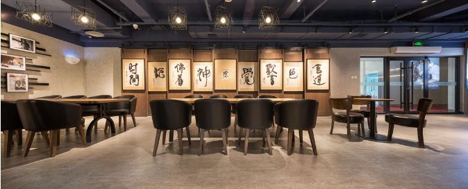 门口右侧的墙上挂着冯唐的9幅真迹:时间、佛着、欢喜、色......每一幅都让人定神沉思,C位的“撩”尤甚,字不大,却让人心头一痒;