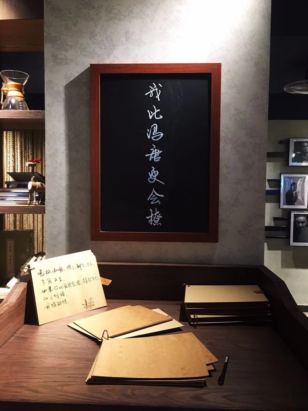 或者以诗“撩”友:书架边设置了「尬诗角」——“我比冯唐更会撩”,你可以在装订成册的牛皮纸上写下三行情诗,与冯唐隔空互撩。