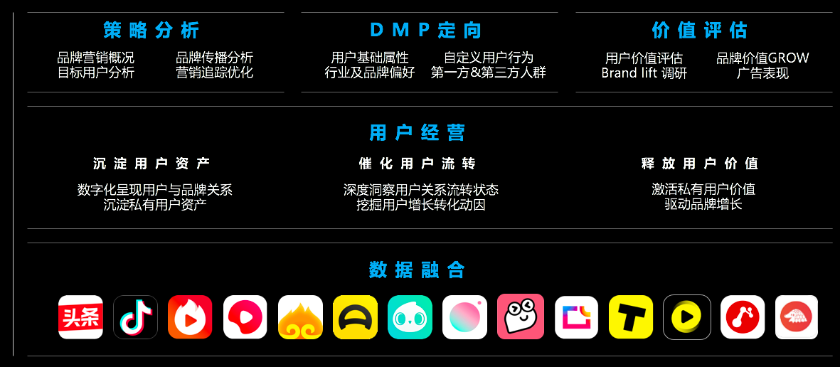 用户经营模块基于品牌&用户的关系还原,一方面有效量化并沉淀品牌资产,另一方面将数据洞察直接作用于投放,在巨量引擎这一超级内容平台之上,利用每一次的营销活动促进用户关系流转,强效激活用户价值;