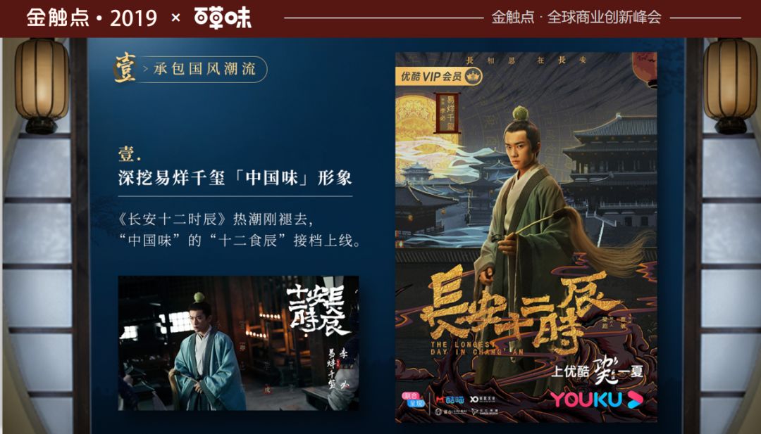 刚才说易烊千玺人设上面,我们用了六个人设拍片子,我们也希望每一条都传达国潮文化,2018年和2019年,不管是故宫或者颐和园,只是把视觉形象用在包装上面,放在衣服上、杯子上,我们希望品牌方传达国潮背后,每个中国人对每个国潮文化后面,或者更多的内容思考,我们会把《长安十二时辰》的唐朝文化展现,比如品尝、宵夜,这些都是通过易烊千玺来展现,做到国潮不只是视觉形象,还有文化来传递。下面这个片子大家可以看一下,我们不希望国潮文化是古板的内容,我们希望我们的国潮内容可以让粉丝哈哈一笑。