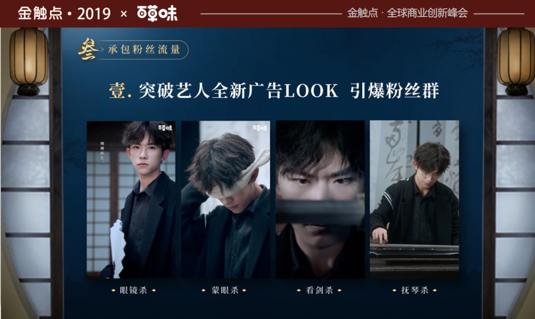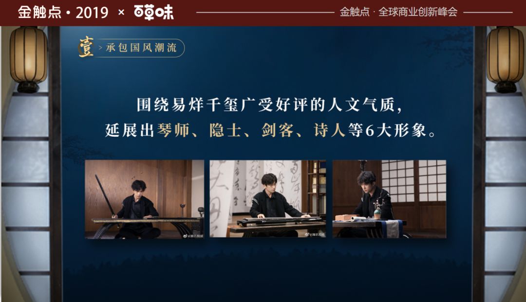 那么我们提出了一个概念,百草味明星演吃会,那么大家可能会想什么是演吃会?明星一边开演唱会一边吃?我们第一的是这样做的,第一是承包国风潮流,第二是短视频制作,我们给他赋予更多人设,比如诗人、剑客、抚琴,这些都是满足粉丝艺人在古装以外的人设,我这里简单放一下我们其中的片花。