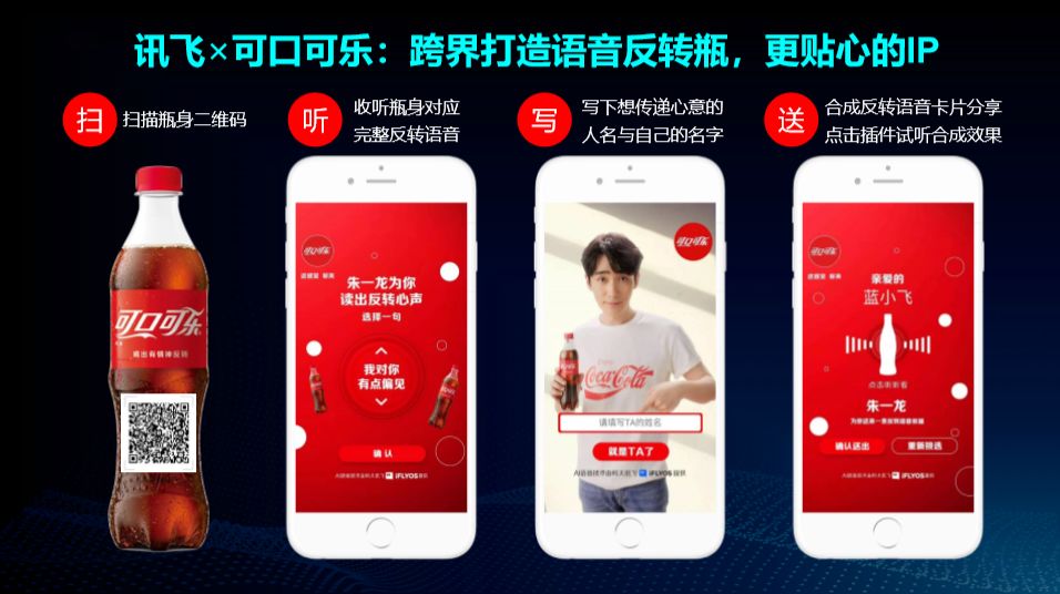 回归到营销的终局,人还是最重要的,有了更多的触达渠道,如何提升用户体验即触达用户的形式也至关重要。在与用户交互上,讯飞也积累了很多创新的案例,比如可口可乐语音瓶,通过科大讯飞的智能语音技术,用户不仅可以让朱一龙念出自己的名字还能够为朋友送上定制的语音祝福语,带给消费者独一无二的个性化体验。
