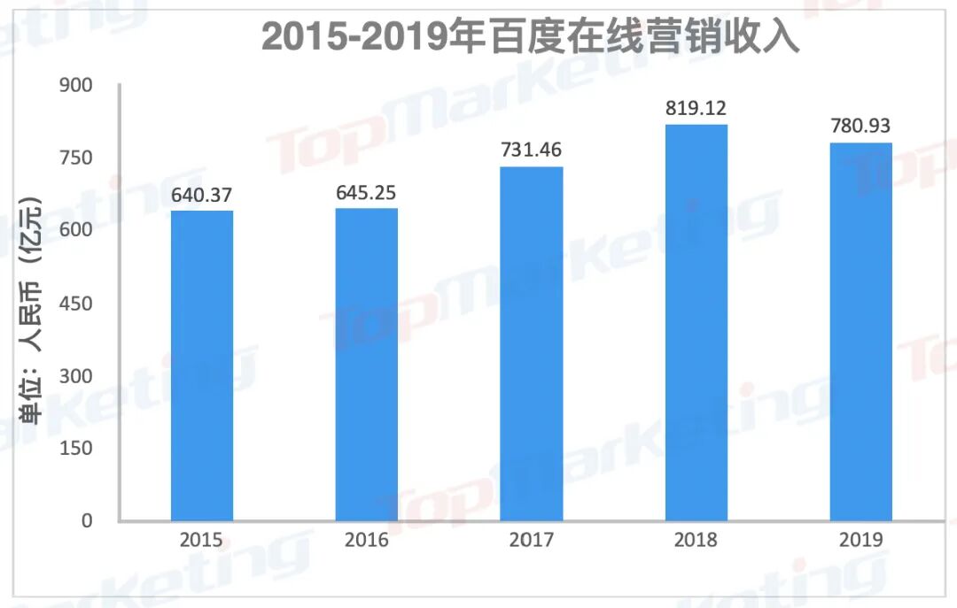 2019年,百度在线营销服务营收为780.93亿人民币,较2018年的819.12亿元下降了5%,这是五年以来百度广告营收首次出现负增长。