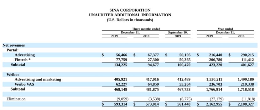2019年新浪净营业收入为21.6亿美元,同比增长3%。其中,广告营收为17.4亿美元(按2019年美元平均汇率US$1=RMB6.9,约为120亿元 ),较2018年的17.9亿美元下降了3%,主要原因是门户广告收入的下降。