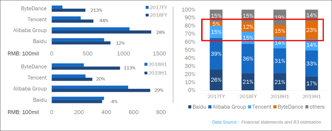 根据界面新闻的报道,字节跳动在2019年的总营收已超过1400亿元。去年11月份,国际咨询机构R3也曾估测在2019上半年字节跳动上半年广告营收增长113%,已经占据中国数字媒体支出的23%,超过了百度(17%),仅次于阿里巴巴(33%)。