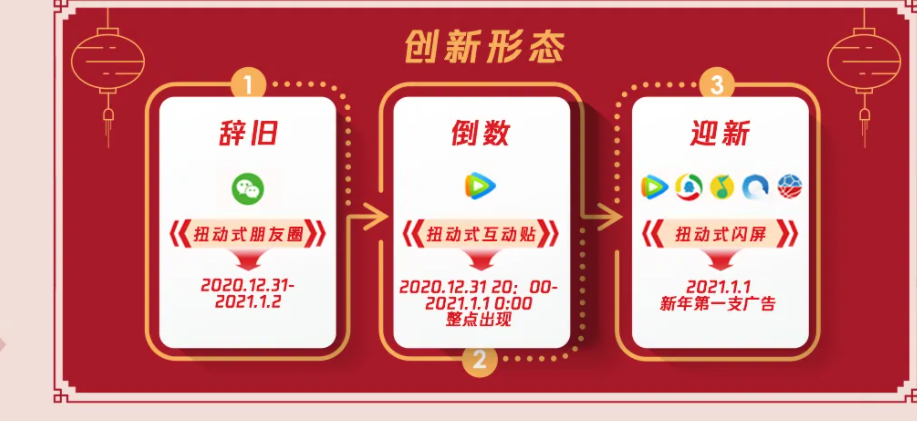 在跨年的仪式上,6大平台分批次有节奏地进行配合,由微信《扭动朋友圈》进入辞旧模式,腾讯视频《扭动式互动贴》继续倒数,再由多个平台联合《扭动式闪屏》开启迎新。