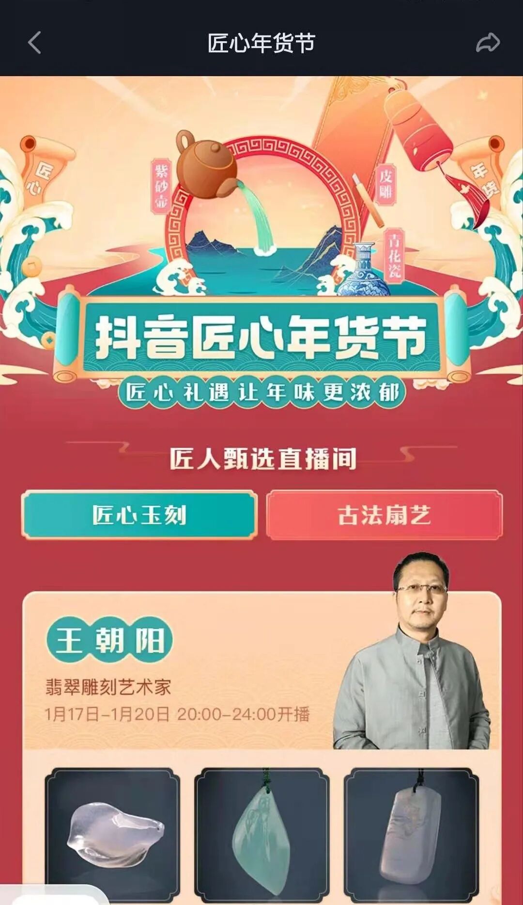 具体体现在活动专题页、文化名人、以及文化商品几个方面。在抖音搜索“年货节”点击进去的落地页里,专门设置了“匠心年货节”专题。可以看到“甄选匠人直播间”,每天推荐一位文化匠人展开直播,涵盖雕刻、陶瓷、刺绣、笛箫、银饰等多个领域。