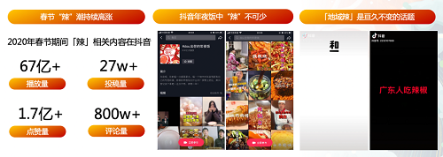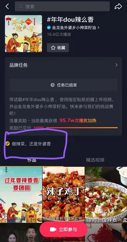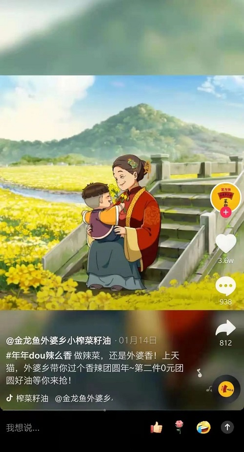 “摇啊摇,摇啊摇,摇到外婆桥......”近几天,TOP君打开抖音总时不时刷到这首童年经典歌谣,怀旧的旋律伴奏下,视频内容却几乎都与做菜有关。本君一边感叹凭一己之力把抖音刷成了一个美食App,一边开始探究到底是谁掀起了这个怀旧style。顺着这段音乐,TOP君顺藤摸瓜找到了发起者,竟是金龙鱼旗下品牌—— 外婆乡小榨菜籽油。没错,就是以前电视上那个金龙鱼,也是几乎家家厨房里都有的那个金龙鱼。虽说近一年传统品牌入驻抖音并不算稀奇事,但像食用油这种品类,使用场景比较固定,要玩出花样并不容易。外婆乡小榨菜籽油为2021年春节发起的传播话题中,还有特色年味回忆贴纸、全网魔性传播、达人精品共创站内外资源联动等一系列完整的传播策略,花式建立“做辣菜就用外婆乡”的用户心智。截至目前,话题#年年dou辣么香 播放量已超18亿次,让人不得不好奇到底使了什么高招。春节营销历来是品牌兵家必争之地。金龙鱼作为一个占据中国人餐桌的国民品牌,与消费者日常生活、尤其是节庆团聚的日子,有天然联系,这是一个优势。但关于新年的场景太丰富,可以营销的元素也很多:团聚、送礼、代际关系、亲情等等。如何从中找到独属于品牌自己的元素?外婆乡小榨菜籽油发现了几个“最自己”、同时也“最大众”的洞察点。首先是“吃”。关于春节,从小年夜的饺子到除夕的年夜饭,“吃”是万万不可少的一个环节。外婆乡小榨菜籽油作为厨房料理刚需,与“吃”的场景的联系是必然的。但这也是所有相关品类可以想到的,想要深入打动消费者,洞察还需更进一步。于是,结合抖音大数据,外婆乡小榨菜籽油发现了“辣”这个热议点。数据显示,2020年春节期间,抖音上关于“辣”的播放量达67亿,点赞量1.7亿。