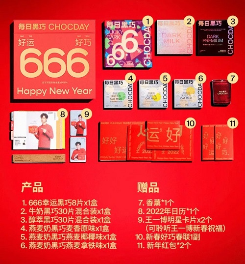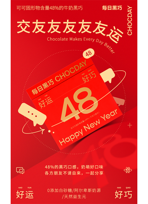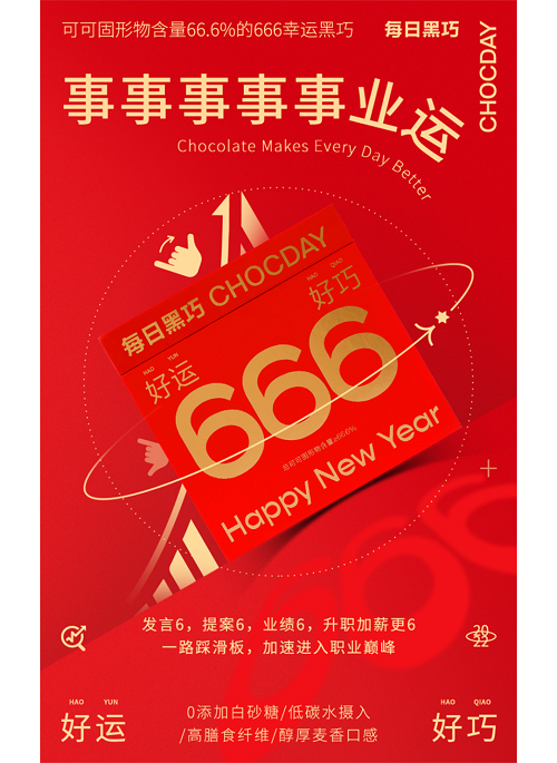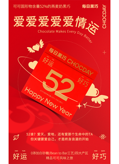 52=爱情运,52%的燕麦黑巧送给对象秘语就是“我爱你”;666=事业运,66.6%幸运黑巧祝福友人升职加薪事业溜;98=财富运,98%的醇萃黑巧预示新年财源滚滚,就是发;48=交友运,48%的牛奶黑巧代表广交四方好友。