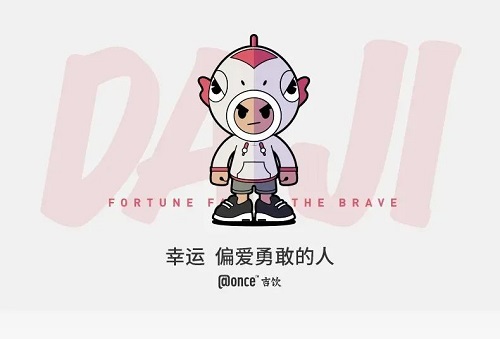 吉鲤的原型是鲤鱼,古话讲“鲤鱼跃龙门”,大家可能看到的是运气,但实际背后是跃龙门的勇气,就像我们的slogan“幸运,偏爱勇敢的人”,吉饮里又包含了“吉”这个字,我们希望讲清好运这件事,希望告诉大家好运并不是躺在地板上就能得来的,而是不断尝试之后的结果。