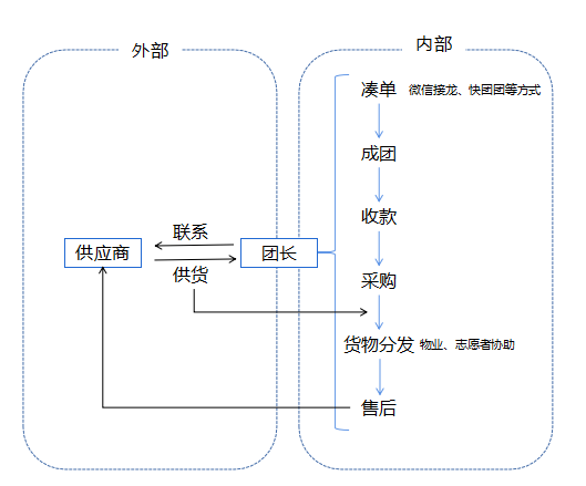 面对这种情况,一些市民开始寻找自救之路,他们审时度势、各显神通,带领大家寻找“生存之道”——社区团购。所谓社区团购,是指由团购组织者(俗称“团长”)带领社区居民进行物资采购的过程,以下为团购流程。
