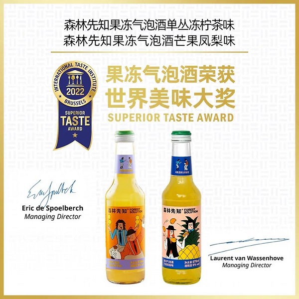 然而,2020年成立的「森林先知」却在2021年选择转型升级,主打产品也从功能性果冻一跃成为果冻气泡酒,并于同年入选央视大国匠心栏目。“酒里有整颗果冻,满足微醺的快乐”,森林先知是国内市场首个将果冻与气泡酒结合,并选用玻璃瓶的品牌,上线三个月,累计售出70000瓶+,铺货6000+门店。其单丛冻柠味和芒果凤梨味的果冻气泡酒获得了国际顶级美味大奖SupeRIOr Taste Award 美味奖章,该奖项被誉为全球食品界的“奥斯卡”奖。