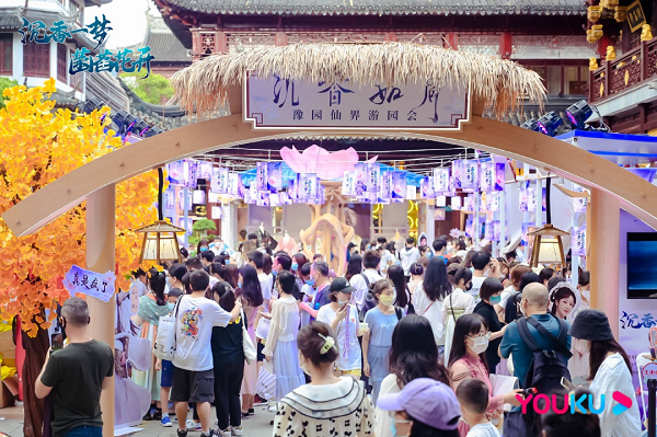 9月2日到4日,“沉香世界”从线上来到线下,落地上海豫园,打造了一场“仙界游园会”。现场人流火爆,三天时间超12.2万人次打卡沉香仙界。不少剧粉慕名而来,也有很多游客融入其中。社交媒体上,香饽饽们纷纷晒出自己的仙界体验:专属的菡萏手链、必胜阁的棋局、龙牡少年门的投壶游戏、黄氏响声丸团扇…还有很多非上海“香饽饽”实名羡慕,强烈要求加更外地场。现场还原了剧中同款秋千、屏风吻、邯郸烛台等名场景,其中“睫毛许愿”的互动话题#沉香如屑把睫毛许愿玩明白了#更是卷入剧粉疯狂讨论,登上微博热搜主榜22位。游园会相关话题阅读量累积突破1亿,可见其热度之高,且精准戳中了剧粉的嗨点。一场《沉香如屑》的“仙界游园会”,是如何成为了内容、用户、品牌和平台的四重狂欢?《沉香如屑》的“豫园仙界游园会”,既毗邻沉香的结局日,又临近中秋传统佳节。整场游园会高度还原沉香仙界,带来至美且趣味的的东方美学内容体验。剧迷们纷纷来此狂欢,从观剧人,变成剧中人。