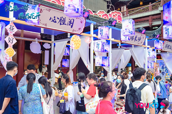 沉浸美!《沉香如屑》的仙侠美学体验让众多剧迷流连忘返,缥缈云海、星河漫天、琪花瑶草、神霄绛阙等场景都让狂热的粉丝群变身夸夸群。这次仙界游园会,延续了《沉香如屑》的美学基因,打造了一场建构在真实人间的国风仙境。在豫园古色古香的背景中,活动还原了沉香世界。入口处巨型的沉香花灯、华丽又温暖的灯笼矩阵、热闹的集市、剧中让无数剧迷神伤的了无桥、诞生了无数把糖的苟诞居等场景,均引来许多“仙界游览者”的打卡。很多用户成为了夜间游园的安利者。因为每到18时,广场中心菡萏巨型灯座点亮,干冰机和雾机释放出“仙界气场”,呈现出“菡萏花开人厮守”的氛围。有很多用户后悔没有身着汉服而来,错过了沉浸式融入仙界的机会。游园会还和豫园深度互动。乌龙剧团带来了豫园廿肆节气高跷巡游节气文化表演,节气使者、秋官、桂花仙子、丰收神、玉兔等传统文化元素惊艳亮相。游园会和豫园表演相互借力,形成了极具质感和中秋氛围的东方美学沉浸场景,为用户不断升级体验。