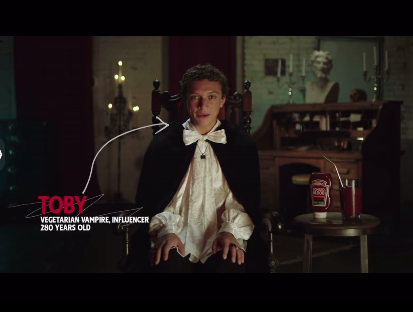 一个吸血鬼张开嘴露出獠牙,他是要吸血了吗?不,他正准备食用亨氏番茄酱。Heinz邀请28岁的素食主义吸血鬼Toby进行采访,讲述他对亨氏番茄酱的喜爱。