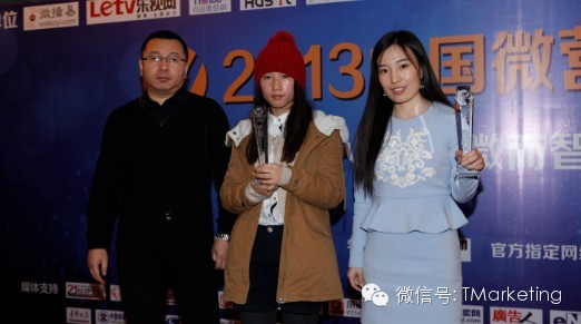 2014年1月10日,北京。公牛电器品牌经理张文敏(右一)在TopMarketing与北京大学共同举办的“2013中国微营销盛典”上领奖。公牛电器联合维拉沃姆策划执行的“专注与你相连”案例斩获2013中国微营销精品案例(整合类)金奖