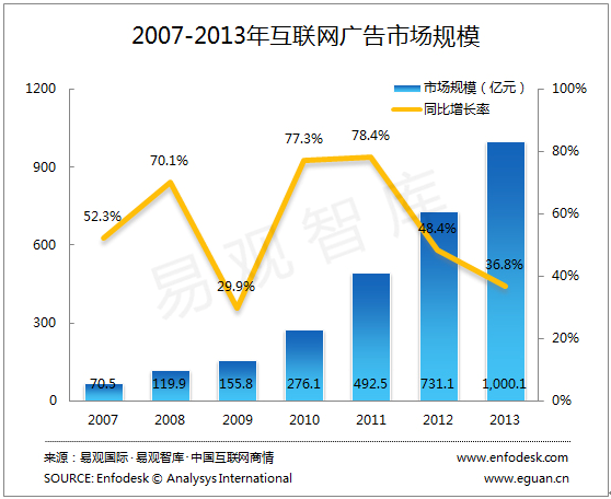 易观数据显示,2013年中国互联网广告市场规模达到1000.1亿元,较2012年增长了36.8%,增速略有放缓。易观研究发现,新技术的发展将驱动整体互联网广告市场的持续发展,尤其是DSP和RTB的概念自2012年进入中国,经过一年的教育市场,广告主和媒体开始对于新型的资源整理方式接受程度逐渐提升,这种新型广告形式开始进入快速发展期,从而将驱动整体互联网广告市场的发展。