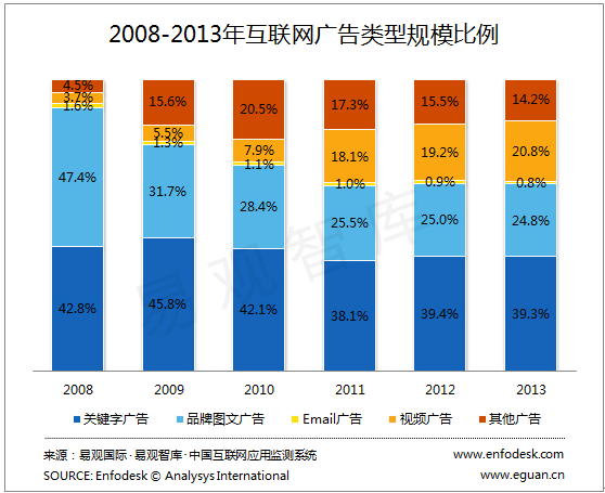 按广告类型划分,其中,关键字广告仍占有稳定的规模优势,占比为39.3%,品牌图文广告的占比持续缩减,2013年的占比为24.8%,而以视频广告为代表的富媒体广告占比稳步提升,占比提升至20.8%。