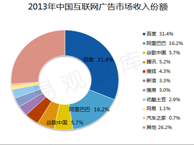2013年,百度依旧保持领先地位,这主要得益于广告主对关键字广告稳定的认可度,以及百度持续在视频等品牌广告服务的战略升级,进一步优化了客户及服务结构,2013年,百度占比31.4%;活跃的电商广告主,以及阿里妈妈的全网流量交易平台和RTB广告布局日臻完善,使得阿里巴巴拥有较大的竞争优势,2013年占比为16.2%;谷歌中国因服务的退出,发展前景堪忧,2013年份额降至5.7%;腾讯、搜狐、新浪等综合门户,通过积极整合视频、社交、娱乐、生活服务等元素进行转型,在整体互联网广告市场保持了良好的表现;同时,视频、房产、汽车等网站成为主流的垂直媒体,2013年跻身行业前列。