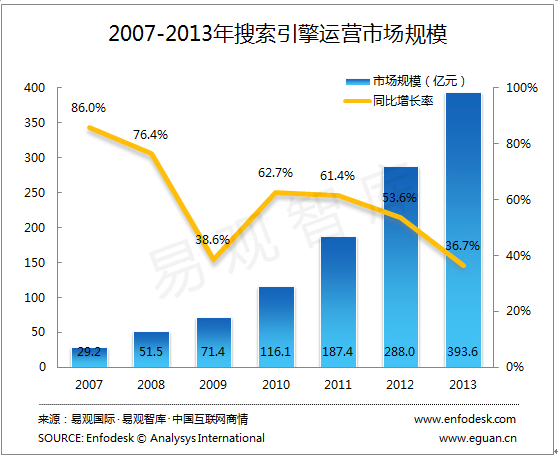 聚焦在搜索引擎市场,易观数据显示,2013年,中国搜索引擎运营商市场规模达到393.6亿元,较2012年增长36.7%。易观智库研究发现,整体搜索引擎市场发展平稳,随着市场规模的不断扩大,增速放缓,但随着移动搜索商业化进程加速,未来移动搜索将成为市场主要增长点。