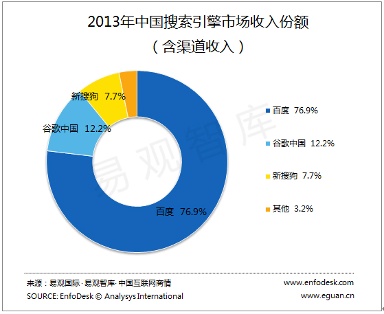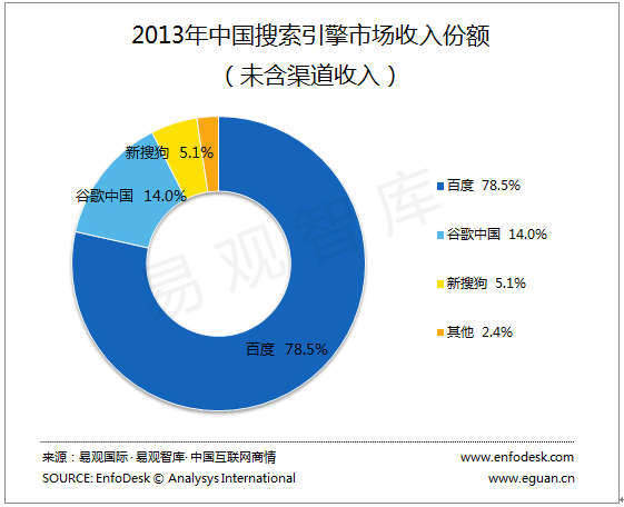 2013年,搜索引擎市场经历了大规模的合并购活动,例如有道宣布与360达成战略合作,有道搜索名存实亡;腾讯向搜狗注资,将旗下搜索、输入法等业务整合入搜狗,新搜狗诞生;社交搜搜引擎云云网被新浪收购。整体市场实现了新一轮的洗牌,市场参与者只剩下百度、360搜索、搜狗、谷歌、bing、中搜。2013年,在未含渠道收入的中国搜索引擎运营商市场收入份额中,百度占到78.5%,谷歌中国占到14.0%,新搜狗占到5.1%;在含渠道收入的中国搜索引擎运营商市场收入份额中,百度占到76.9%,谷歌中国占到12.2%,新搜狗占到7.7%,其他占到3.2%。