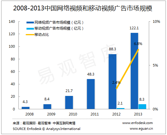 在网络视频市场,2013年,中国网络视频广告市场规模达到122.1亿元,较2012年增长38.2%。2013年,视频企业在PC、Pad、手机、电视等多终端的业务布局,开启了多屏营销的序幕,而在移动端,2013年多家企业加速商业化,2013年移动视频广告市场规模为8.3亿元,占整体市场规模的6.8%。