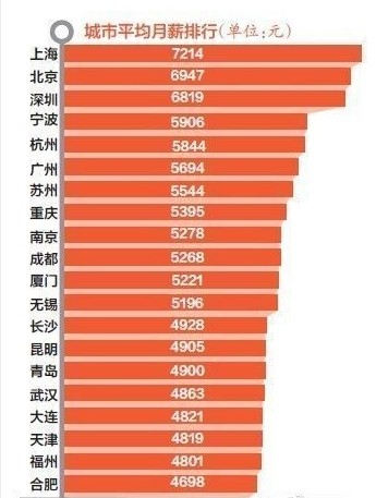 从各城市的薪酬水平看,上海以7214元的月薪高居榜首,超出排在第二的北京(6947元)约300元,深圳以6819元的月薪排第三。接下来依次为东部沿海城市,如宁波、杭州、广州等。长沙白领平均月薪为4928元,排在第13位。