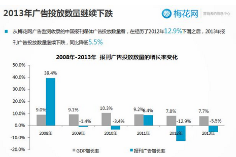 从梅花网广告监测收录的中国报刊媒体广告投放数量看,在经历了2012年12.9%下滑之后,2013年报刊广告投放数量继续下跌,同比降低5.5%。