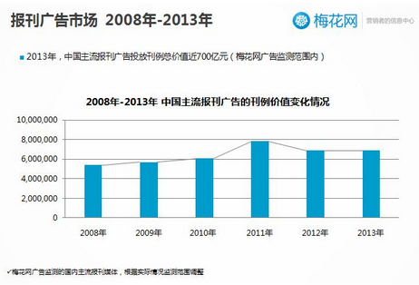 2013年,中国主流报刊广告投放刊例总价值近700亿元(梅花网广告监测范围内)