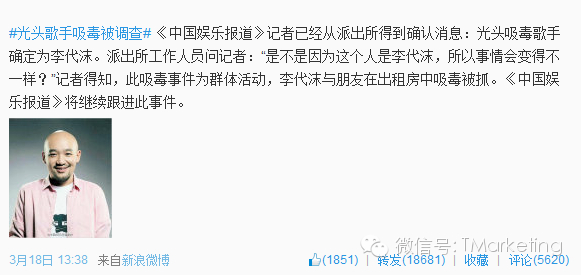 前天中午12点43分,认证为“中国娱乐报道官微”的微博账号爆料,称歌手李代沫卷入吸毒事件,被警方带走调查;16点43分,“平安北京”官方微博确认了这一消息,并称李代沫本人已经认罪。