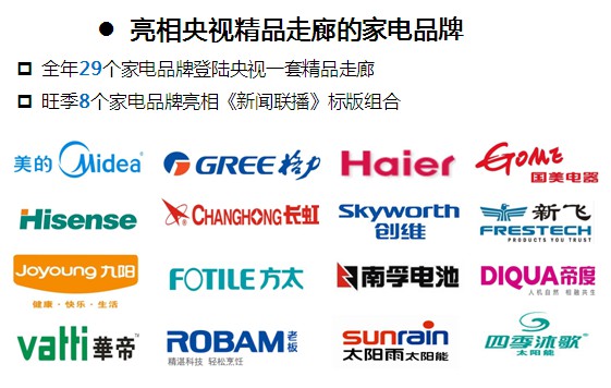 中国家电正是上升的势头,家电企业是中国民族企业的骄傲, 是中国市场仅有的少数几个有定价权的行业。目前,央视一套已经形成了一条“家电品牌精品走廊”,有29个家电品牌投放,旺季有8个家电企业亮相CCTV-1《新闻联播》标版组合。为什么是《新闻联播》标版组合?