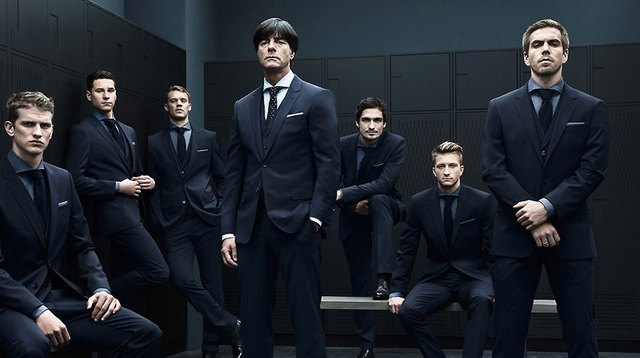 除了球队换品牌,也有品牌换球队的例子,比如Hugo Boss之前中意西班牙,但今年HUGO BOSS想必是看好自家球队夺冠,紧紧绑上了德国队,不仅参加他们场外着装的设计,还请他们为品牌拍摄了代言写真。德国队选择的Hugo Boss最为昂贵,每个队员正装的花费都在4000美元(约人民币25000元)以上。全队23名队员再加上教练组成员,正装花费超过了10万美元。当然,这一切都有赞助商买单。