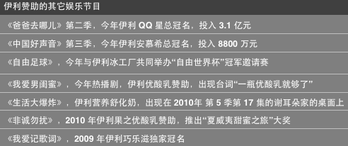 根据数据服务提供商 AdMaster 的介绍,伊利借助与《变形金刚3》合作的推广授权广告,在门户网站、社交网络媒体和视频网站上投放舒化奶宣传广告,并展开 5000 张《变形金刚 3》电影票的抢票活动。伊利营养舒化奶在《变形金刚3》全国公映后销量增长了30%。
