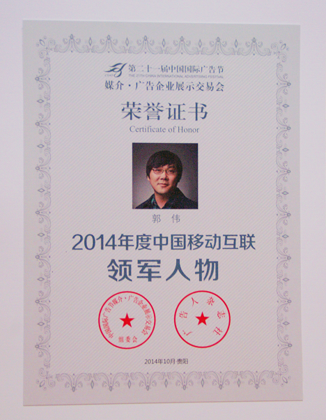 TopMarketing2014年10月25日至27日,中国广告行业最大的盛会“中国国际广告节”在贵阳隆重举行。作为中国最大的移动广告平台的创始人,安沃传媒CEO郭伟以在移动营销领域的突出贡献,连续3年获颁“2014年度中国移动互联领军人物”称号。