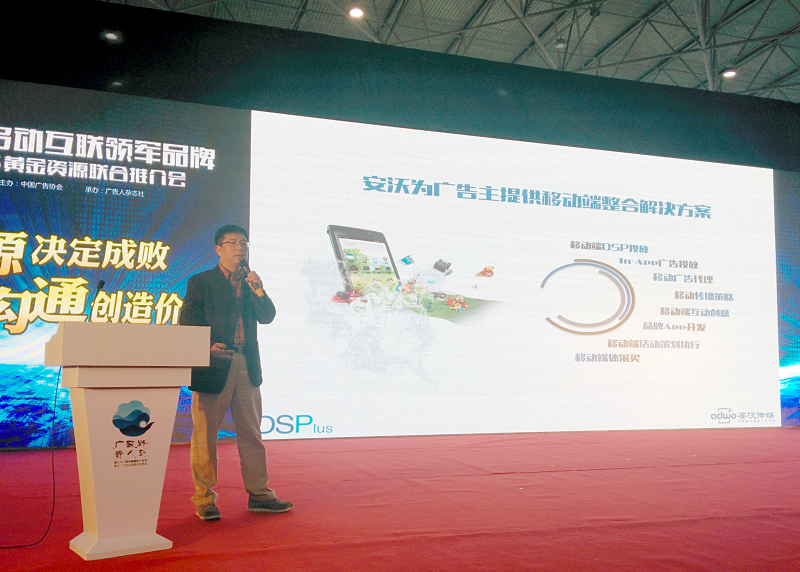 TopMarketing2014年10月25日至27日,中国广告行业最大的盛会“中国国际广告节”在贵阳隆重举行。作为中国最大的移动广告平台,安沃传媒受邀参加了本届广告节,副总裁王振宇在“中国移动互联网领军品牌2014黄金资源联合推介会”上进行了演讲,演讲以《安沃DSP+,最适合中国市场的DSP平台》为主题,从移动广告的行业发展为切入点,以生动有趣的案例展示了安沃传媒面向中国市场的特点,更有针对性的为品牌广告主提供DSP服务。