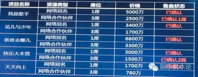 不过仔细分析这张表,csm50城收视率远低于《好声音》系列的《爸爸》却成为标王,而名不见经传的《偶像来了》也有4亿冠名,多多少少令人不解。据一位在代理湖南卫视广告的从业人员小A(化名)告诉小娱,他们所代理的企业对《爸爸3》冠名权的估值都在3亿左右,可以作为例证的是,《爸爸3》并未如《爸爸2》一样,放在招标会上进行公开竞标,而是采用内购的方式。小A解释道:“这主要是方便内部操作一些资源,好搭配送给伊利。”据小A了解,考虑到芒果广告部面子上的问题,真实的冠名费应该还是持平或略超过第二季的:“3.12亿肯定差不多,剩下的1.88亿应该就让芒果折算成各种广告权益包了。”同时,在他看来,《偶像来了》的4亿、《快乐大本营》的3.5亿也都有一定的注水。