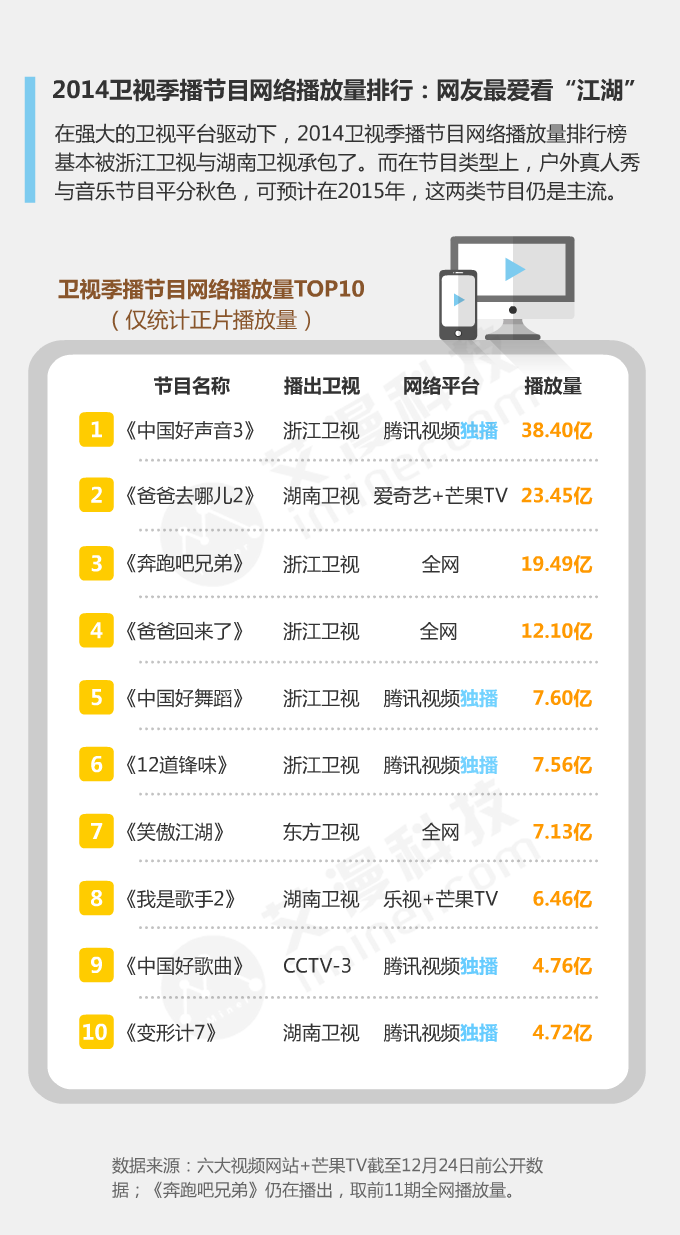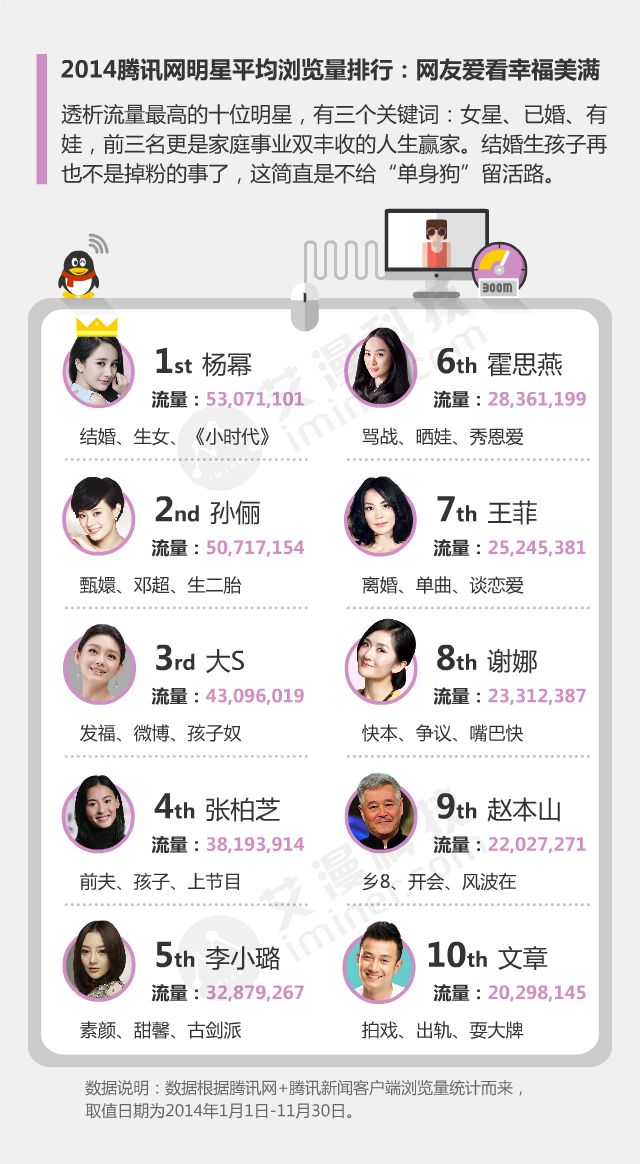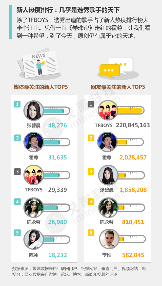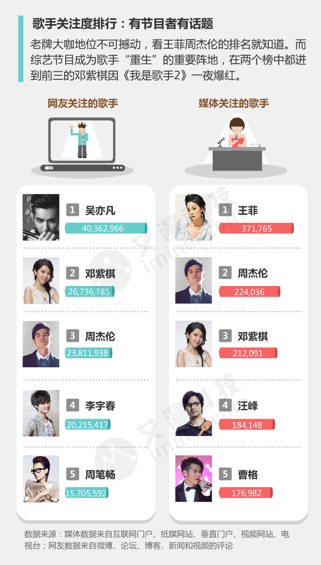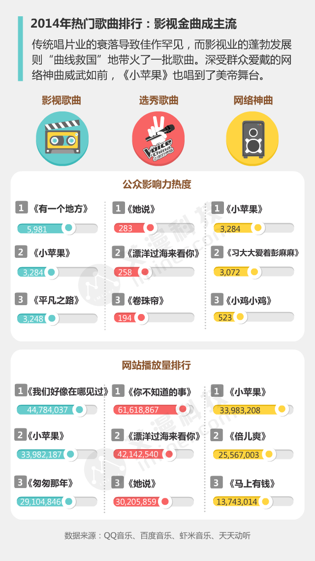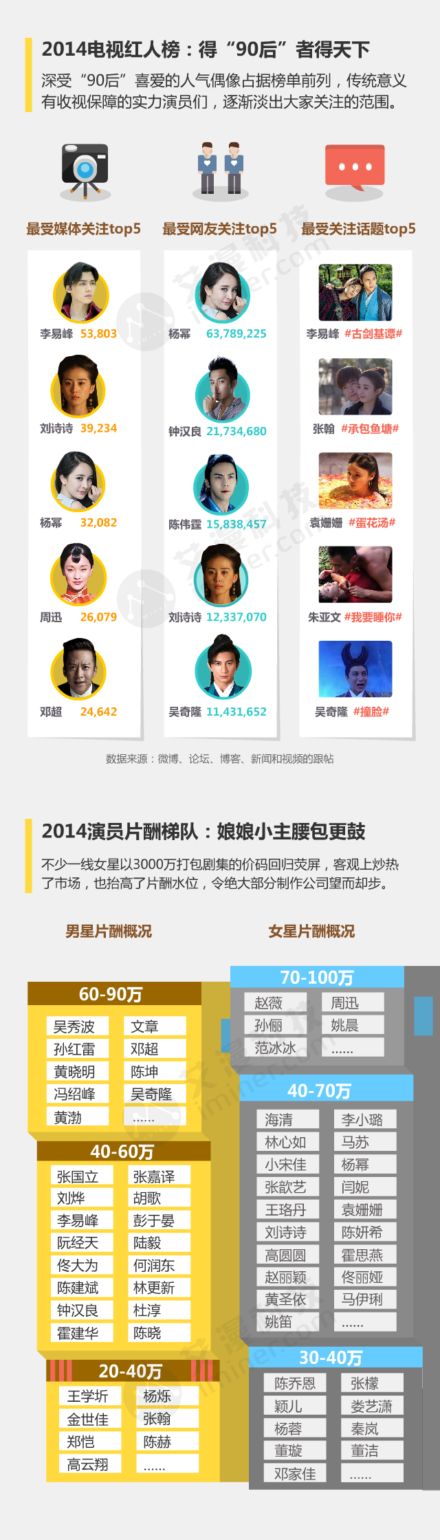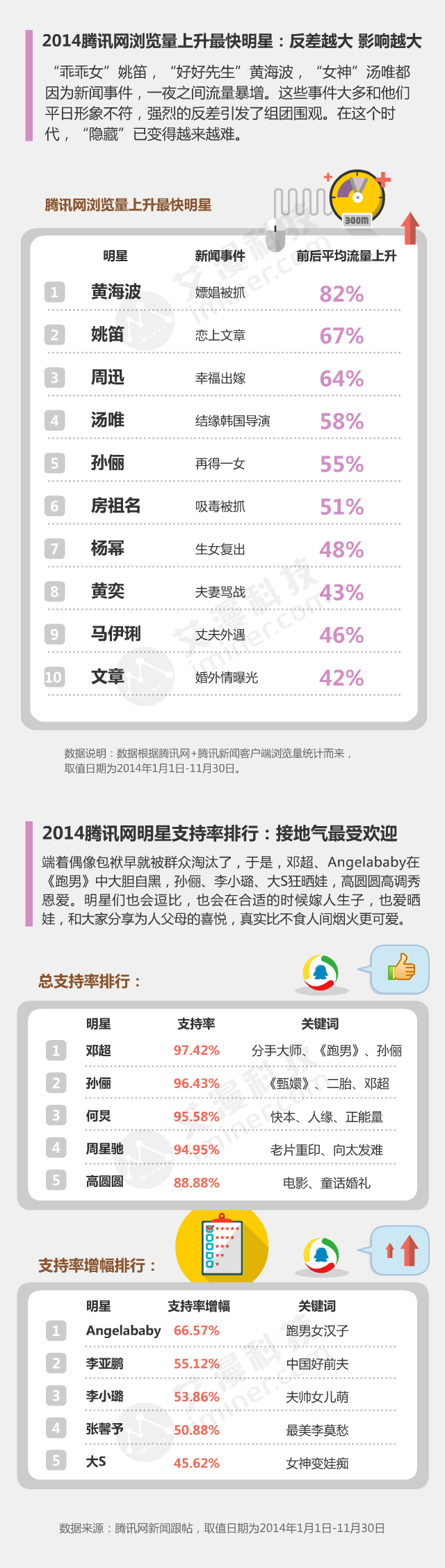 基于这样的追求,我们的编辑部用超过两个月的时间,选择电影、电视、综艺、音乐、明星五个方向,处理繁杂数据,讨论业界趋势,经过精心编辑和设计,推出了《2014腾讯娱乐白皮书》。这一年,这个行业的变化令人目眩:互联网新势力渗透到娱乐各业,与传统影视制作力量相抗衡;互联网公司参投电影、自制综艺节目与电视剧、举办线上演唱会——身份从推广平台转为内容制作商,从产业下游晋身产业上游;移动平台全面崛起,无论是看新闻听音乐还是欣赏影视节目,中国网民将目光从PC电脑屏幕,挪向了手机和PAD屏幕;90后成消费主流,他们的偶像——TFboys、鹿晗、吴亦凡等小鲜肉重拳出击,大有将一干前辈打在沙滩上之势……